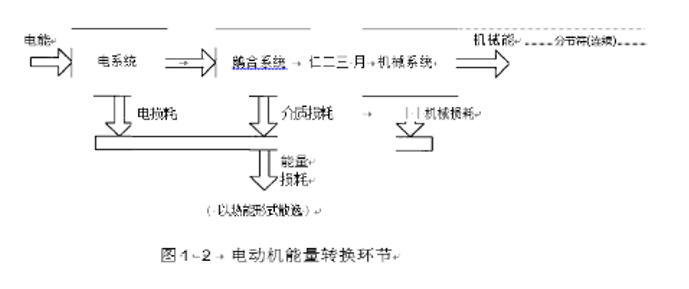 电动机内部实现能量转换包括电系统、搞合系统 和机械系统三个环节,如图 1 - 2 所示 。电动机通常是在其接线端子上输入电能,在铀上输出机械功率。外电路电能通过搞合 系统在机械系统中产生机械能,在机械系统的抽头上以机械能输出,在上述能量转换过程中,三个系统都会产生部分能量损失,最终都以热能的形式向周围环境散逸。